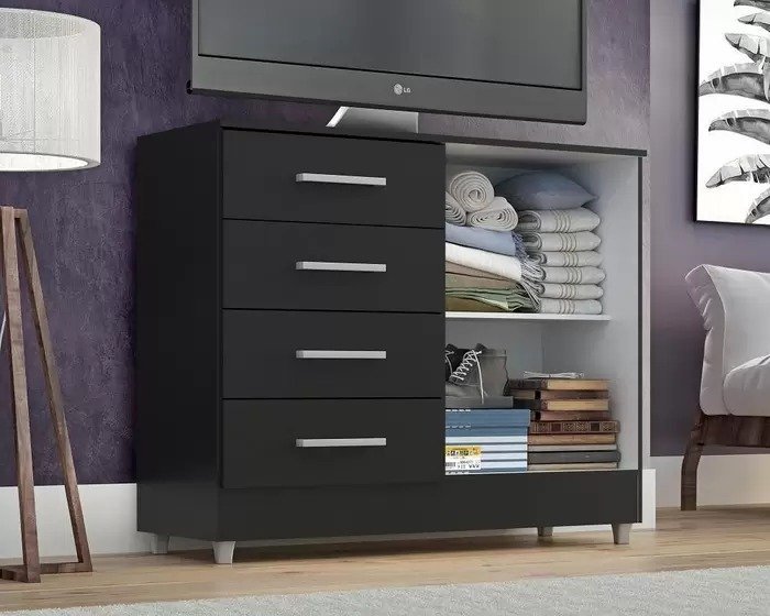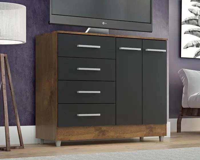 Medidas: Alt 0,90m Larg 1,10m Prof 0,40m, Estrutura 100% MDP, 4 Gavetas com Corrediças Metálicas, 2 Portas de Bater com Dobradiças Metálicas, 1 Prateleira Interna, Puxadores e Pés de PVC. Obs.: Gavetas e Prateleira Suportam até 7kg.