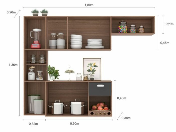 A Cozinha Suspensa Mila é uma solução criativa para otimizar o espaço em cozinhas compactas. Com um design suspenso, inclui prateleiras e compartimentos que oferecem armarzenamento prático para utensílios e ingredientes.