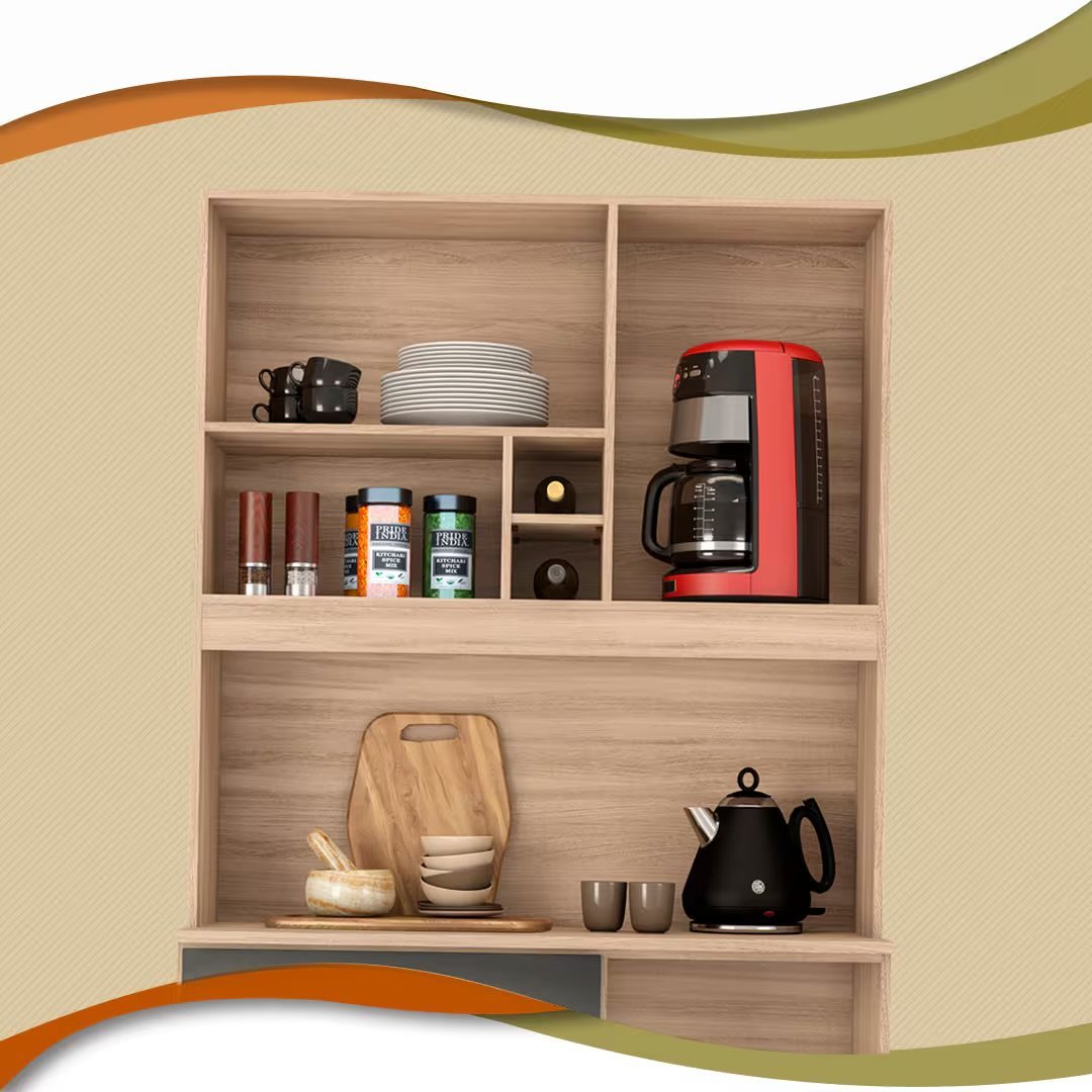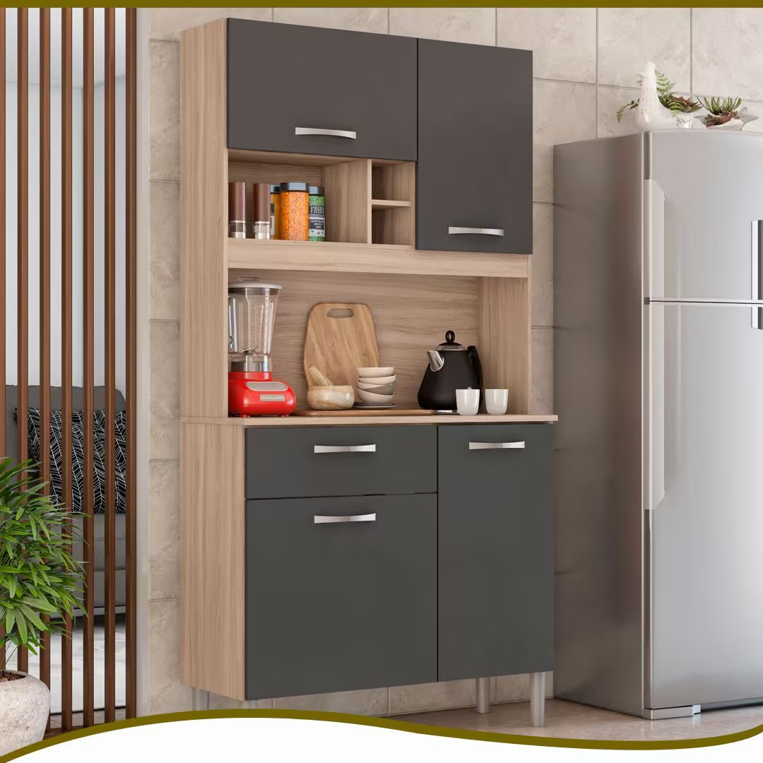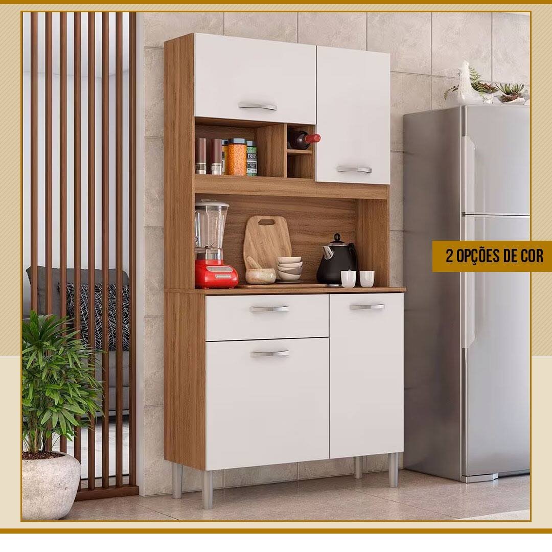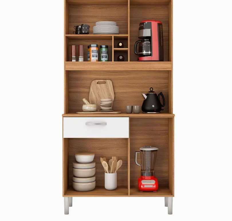 Um armário planejado para acomodar utensílios de cozinha, além de espaço para eletroportáteis, microondas e dois charmosos nichos para acomodar garrafas de vinho.