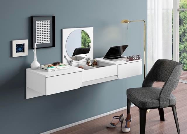 Escrivaninha Penteadeira Elegance, Medidas: Altr 0,315m Larg 1,36m Prof 0,415m, com tampo basculante e espelho redondo com pistão gás, 2 gavetas frontais com corrediças telescópica