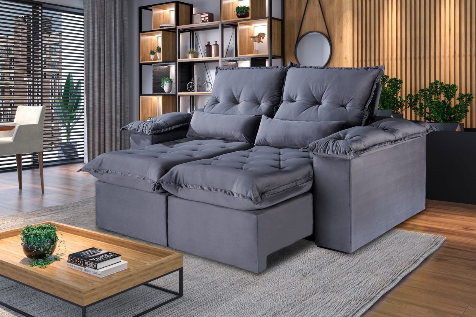 Estofado Retrátil Reclinável Ouro Preto, Tecido: Veludo Jolie, Côr Grafite, da Idealle, Medidas: 2 Módulos: Alt 1,20 Larg 0,70m Prof Fech 1,20m Prof Aberto 1,80m, Braço 0,25m – Estrutura de Madeira, Blindagem nos Rodapés, Caixa Traseira e Parte Superior, Assento com Percintas Elásticas e Molas, Estofamento em Espuma Selada de 20cm Alt, Encosto, Pillow dos Braços e Rineiras 100% Fibra Siliconada.
