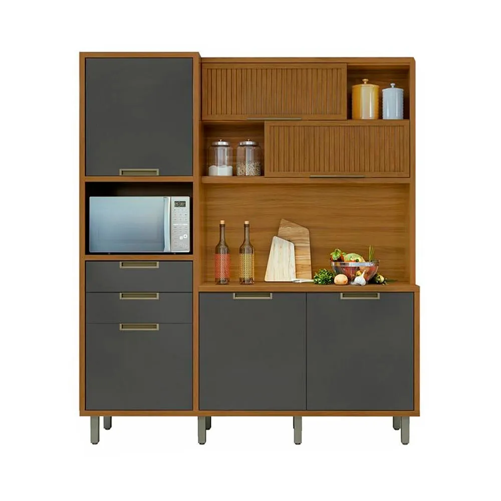 Medidas: Alt 2,12m Larg 1,83 Prof 0,47m, Estrutura 100% MDF em Chapas 15 e 18mm, Tampo 30mm, 4 Portas de Bater com Dobradiças Slow Motion com Freio Anti-Impacto, 2 Portas Basculantes Articuladas com Pistão a Gás e Detalhes Ripados, 3 Nichos, sendo um para Forno 45cm x 39,3cm, 3 Prateleiras Internas, 2 Gavetas com Corrediças Telescópicas com 3 Estágio e Abertura Total, sendo uma com Divisor de Talehres, Fita de Acabamento e Proteção do Totpos 100% Polipropileno, Puxadores de Alumínio na Côr Champanhe e Pés Plásticos Reguláveis.