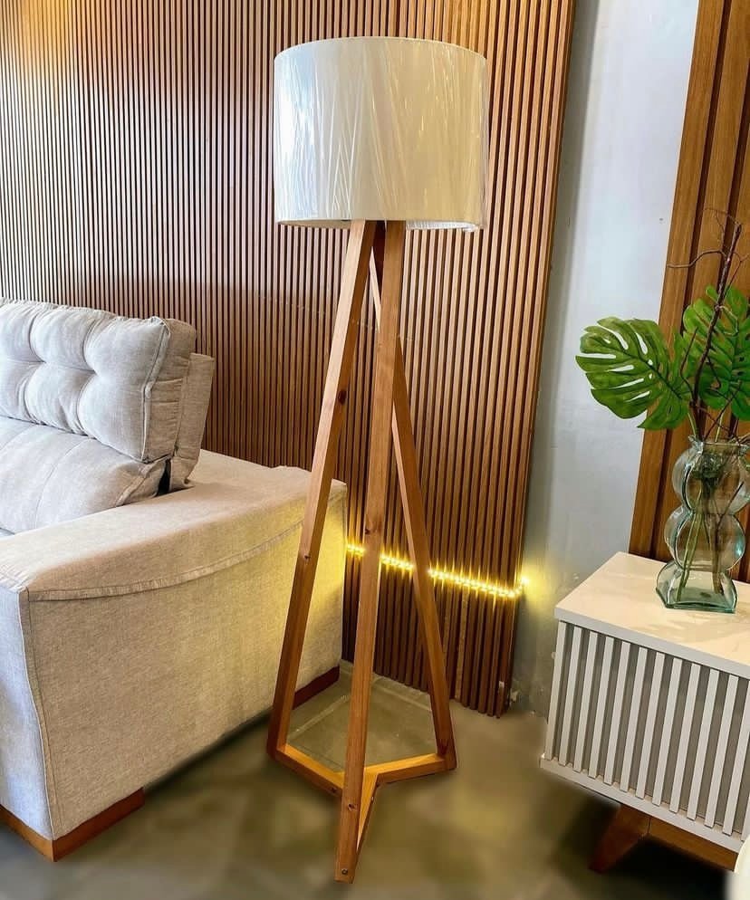 Medidas: Alt. 1.59m Larg. 0,48m Prof 0,48m Peso. 6kg. Estrutura 100% em Madeira Maciça Pinus, Pintura Semi Brilho, Possui Cúpula Revestida em Tecido. Pés em Madeira Pinus 0,35mm. Não Acompanha Lâmpada, Voltagem Bivolt.