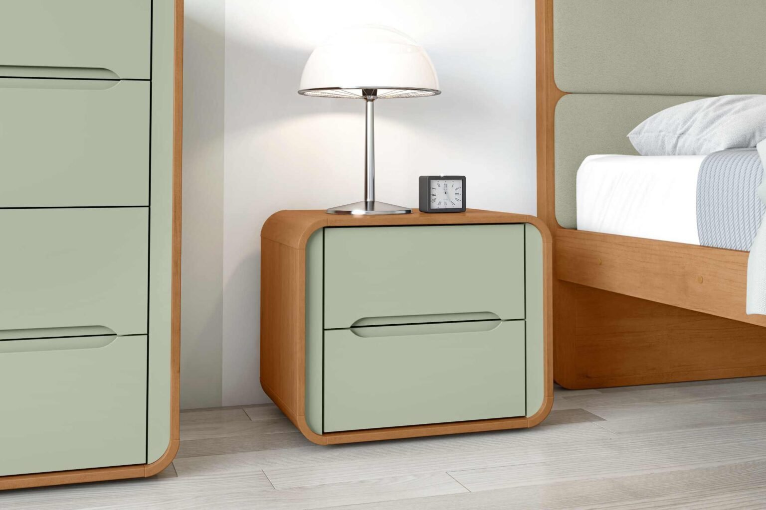 Com duas gavetas espaçosas e corrediças telescópicas, a mesa de cabeceira oferece espaço de armazenamento extra para manter seus objetos pessoais sempre organizados.