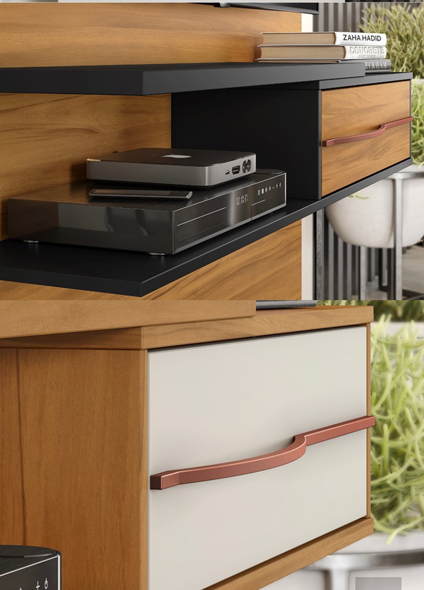 Ele tem capacidade para TV até 55’’ e a prateleira superior, assim como o tampo do nicho, é de 25mm, que garante maior robustez ao móvel, podendo ser utilizado na sala, quarto ou na área de festas.