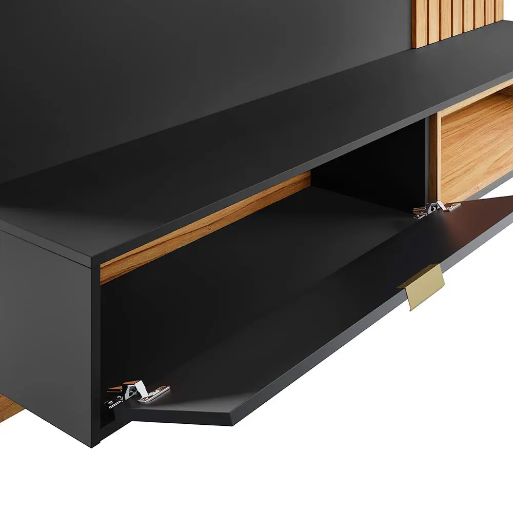 O charme desse móvel está, principalmente, no ripado em seu painel. Ele é formado com peças maciças que são iluminadas utilizando um spot de Led. Possui uma porta basculante com puxador metálico dourado. Além de extremamente funcional, o painel é amplo e comporta Tvs de até 65 polegadas.