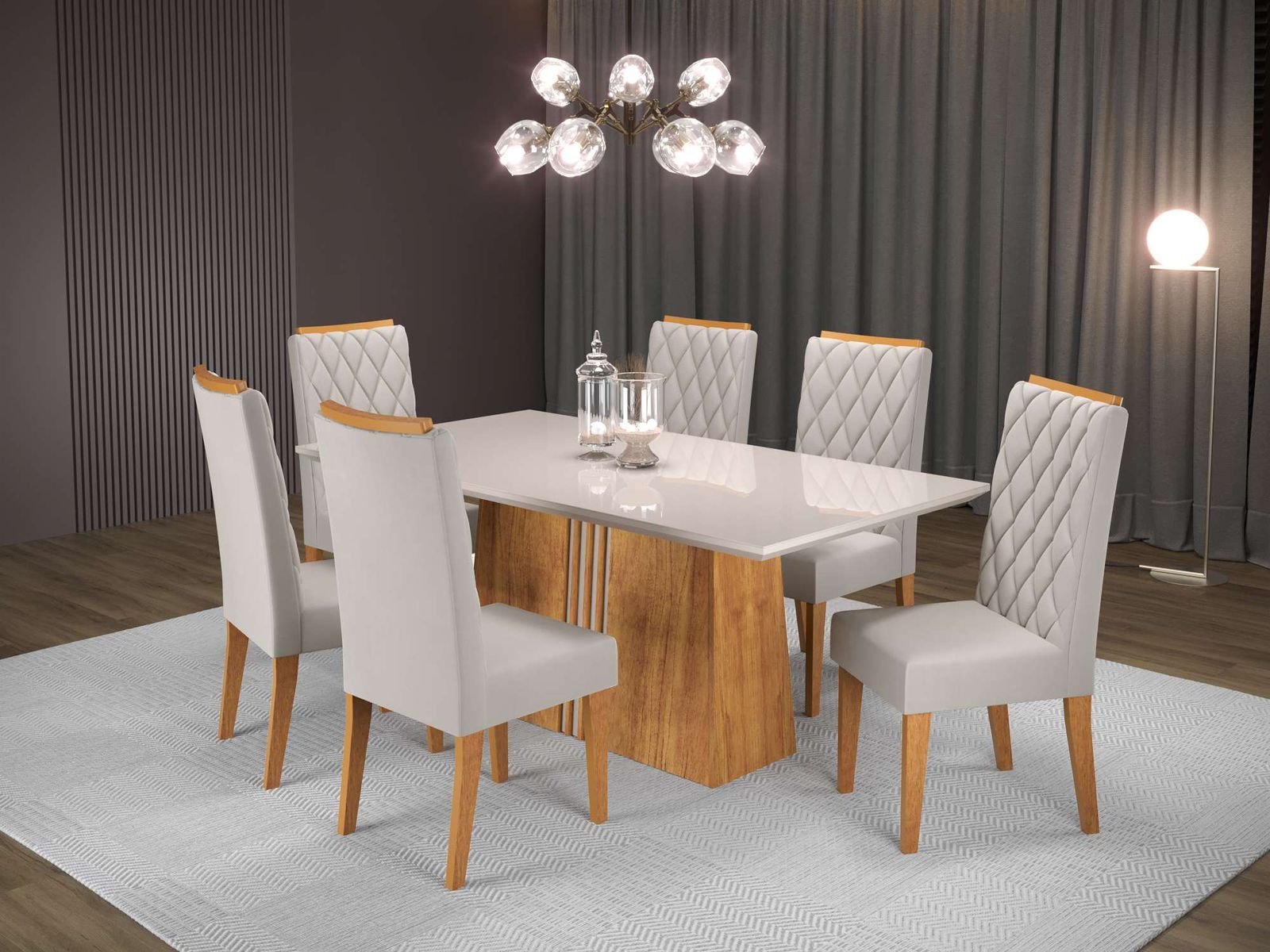 Estrutura MDP/MDF – Tampo Chanfrado de MDF 40mm com Vidro Temperado de 4mm e Canto Reto, Base em Formato de Trapézio na Côr OIff White com Detalhes em Mel, – Cadeiras Iza com Assento Estofado com Espuma D20 e Encosto Estofaado com Espuma D12, Ambos Revestidos em Veludo Marfim. Mesa com Suporte para até 50Kg Distribúidos e Cadeiras com Suporte para até 90Kgg. Acabamento em Pintura UV Sei Brilho.