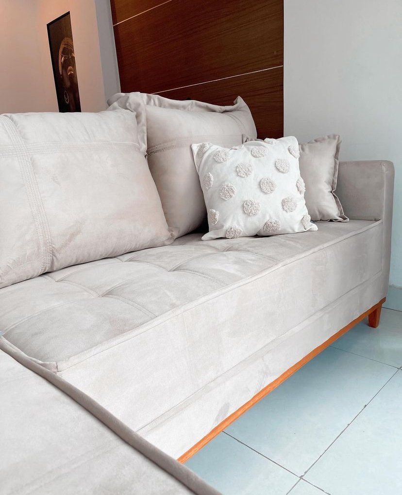 Com suas 5 almofadas confortaveis,braço em espuma d26 e seu encosto em almofada 100% fibra de silicone, seus assentos em EPS /mola ensacada 10cm espuma d23.