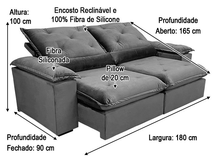 O assento com Pillow top 20cm é retrátil com espuma 28, contem também percinta elástica e molas bonel, que proporcionam uma acomodação extremamente confortável. Almofadas com fibras de poliéster siliconada.