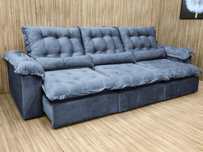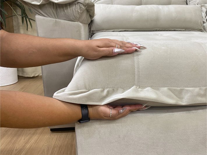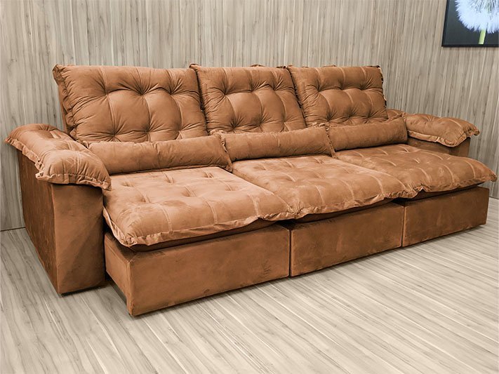 O revestimento é em tecido veludão Premium, deixando a superfície do sofá muito mais macia.